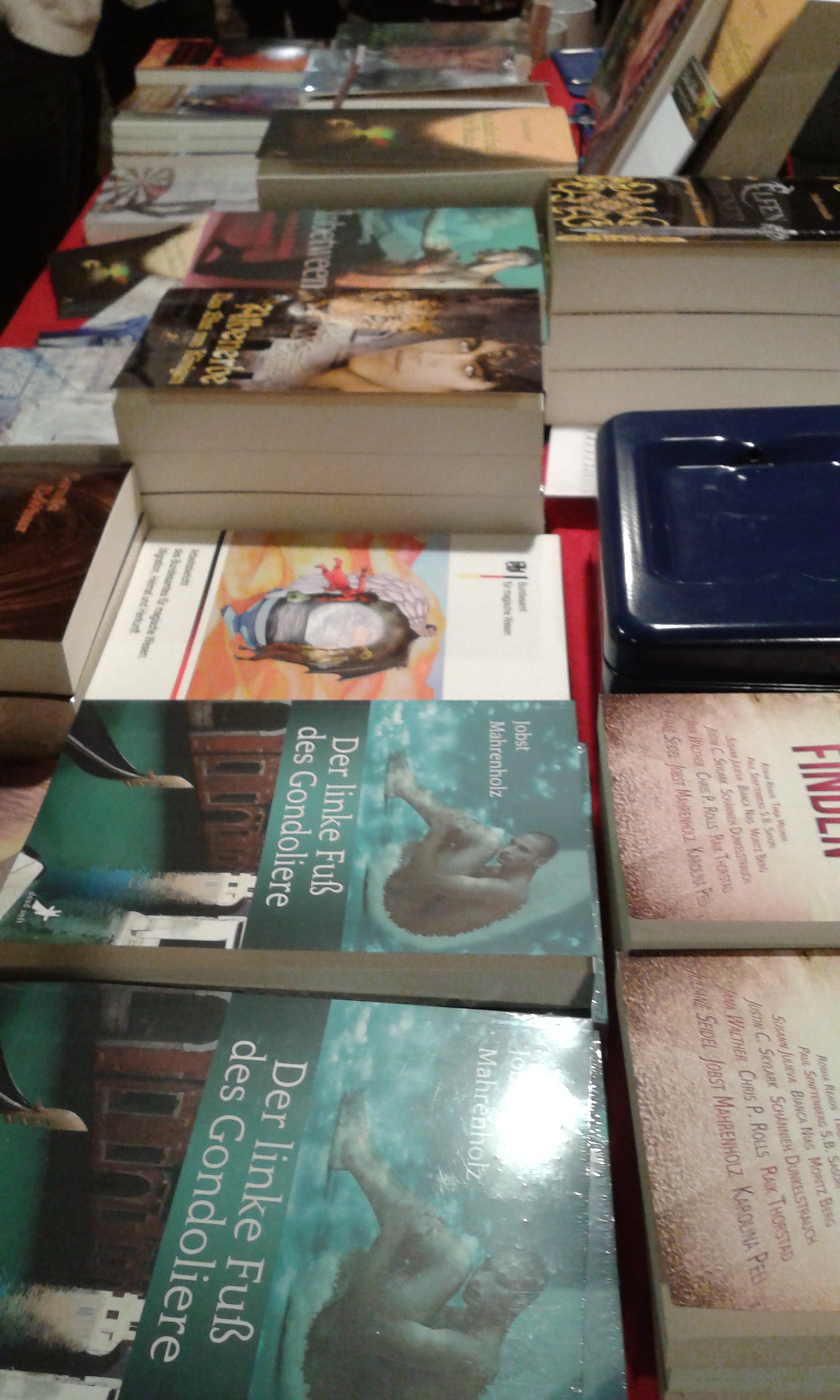 Wir hatten zu fünft (Jobst Mahrenholz, Bianca Nias, Svea Lundberg, Elisa Schwarz und ich) ungefähr 1,50 Tisch zur Verfügung, was für Bücher und mitgebrachte Goodies erstaunlich gut klappte, aber den Nachteil hatte, dass nur drei Stühle dahinterpassten. Überhaupt war es recht eng, und ich bewundere die Bedienungen, die durch das Gedränge dann noch ohne Unfälle Schnitzel transportierten.